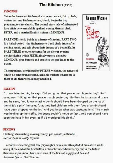En 1957 quand Arnold Wesker écrit The Kitchen, il fait partie d'un groupe de jeunes auteurs de tradition socialiste et anti- conformistes. Elle constitue la première œuvre du dramaturge et sa pièce la plus jouée. Elle a donné lieu à de nombreuses productions dans une soixantaine de villes dont Rio de Janeiro, Tokyo, Paris - une des premières productions largement reconnues du Théâtre du Soleil en 1967, Moscou, Montréal et Zurich. Une version cinématographique est parue en 1961 et la pièce a fait l'objet d'un revival majeur au National Theatre en 2011.