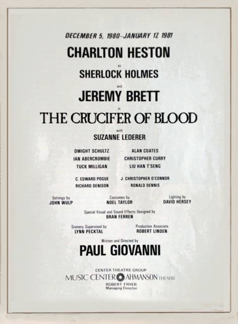 The Crucifer of Blood est une pièce écrite par Paul Giovanni dans les années 70, inspirée de l'œuvre de Conan Doyle. Également mise en scène par l'auteur, elle connut trois productions différentes et une tournée à succès.