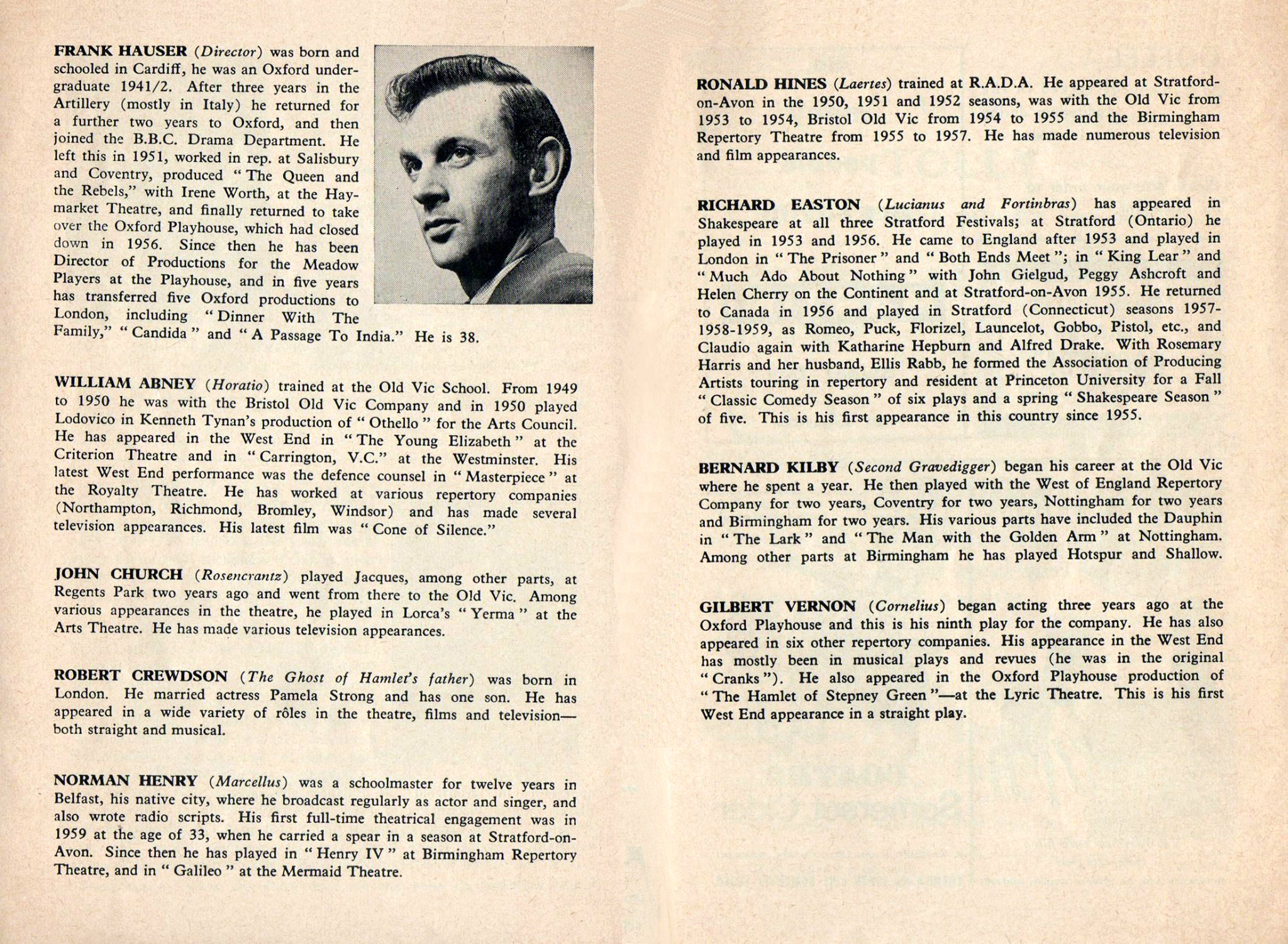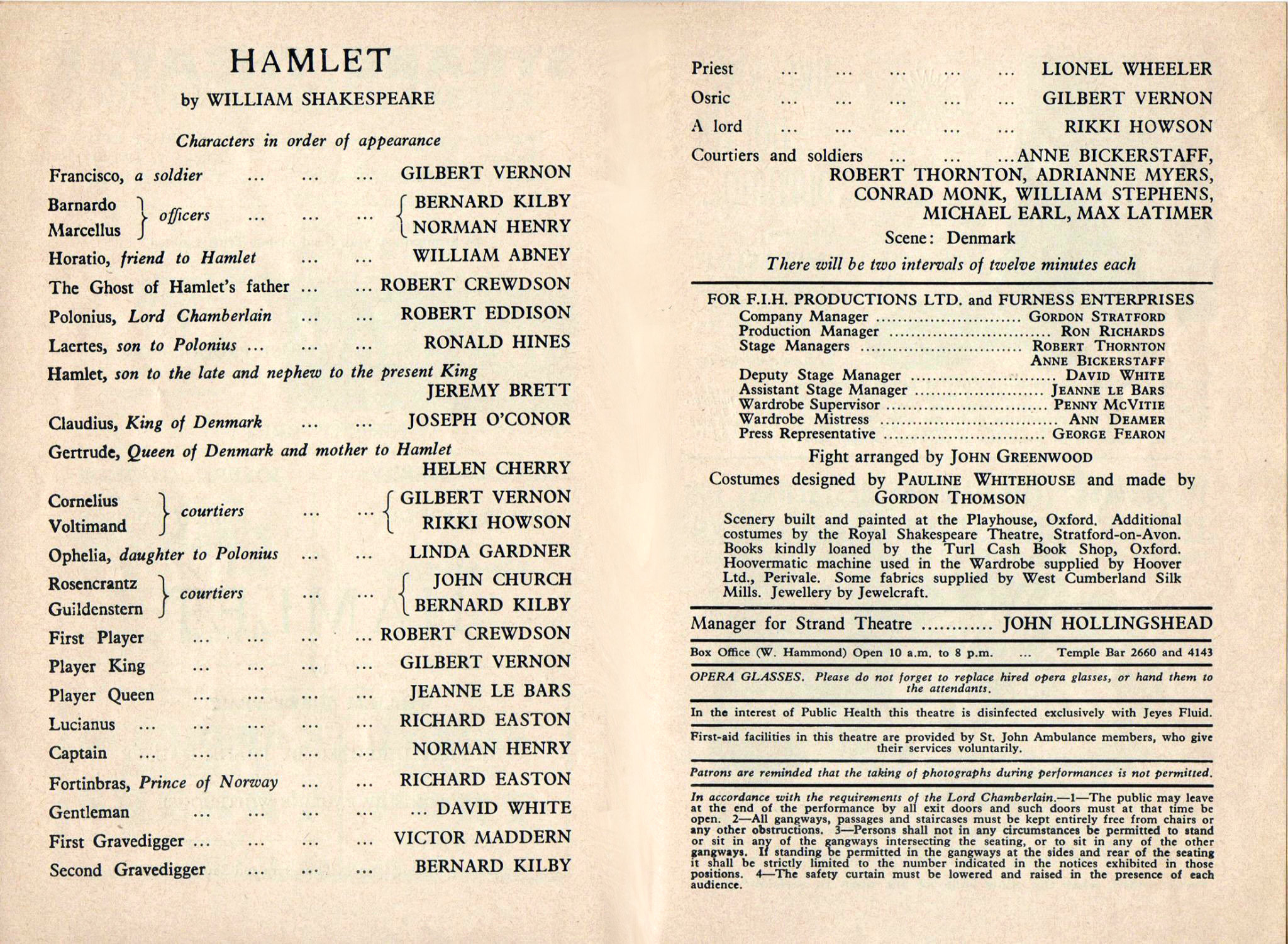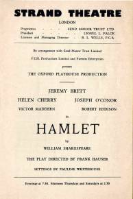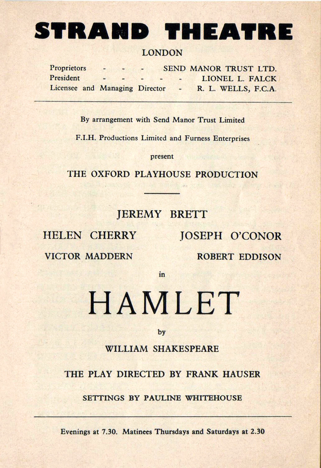 Harold Hobson nota : "Je n'ai jamais vu un Hamlet si brutal avec Ophélie et Polonius que celui de M. Brett. Mais cela semble être la propre innovation de M. Hauser. La brutalité doit être voulue, car elle ne fait manifestement pas partie du caractère de M. Brett ou de sa présence sur scène. C'est un acteur mince et gracieux, au comportement courtois, qui traite tout le monde dans la pièce avec beaucoup d'attention, à l'exception d'Ophelia et de sa famille. Il semblerait que l'idée d'Hamlet, du mariage et de l'amour, ait été salie par sa mère et son oncle, et que, après avoir appris leur traîtrise, il ne puisse plus supporter de voir quoique ce soit qui lui rappelle des relations normales entre hommes et femmes. "