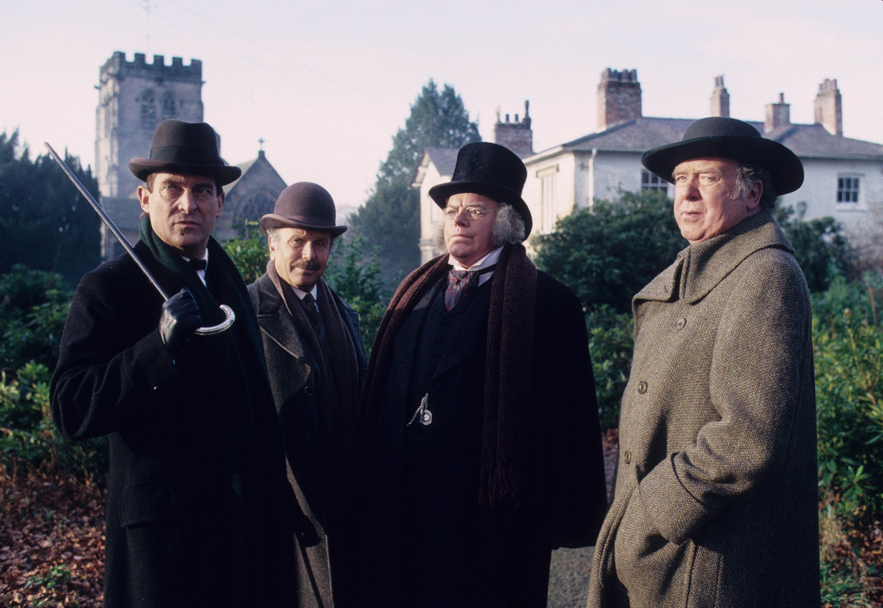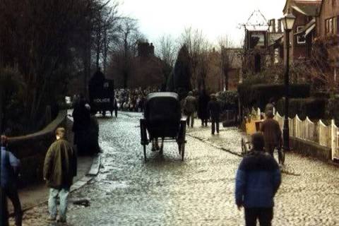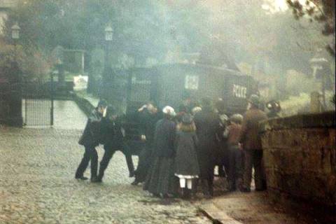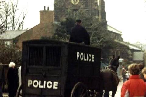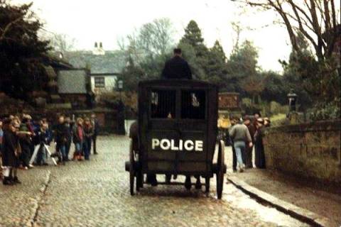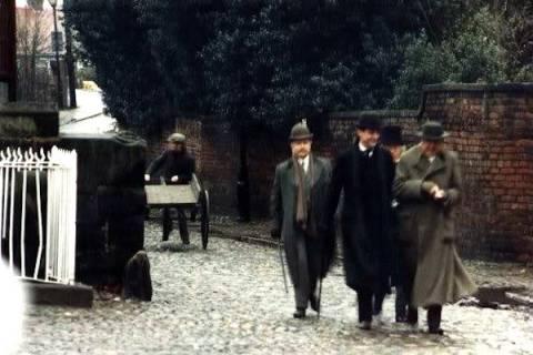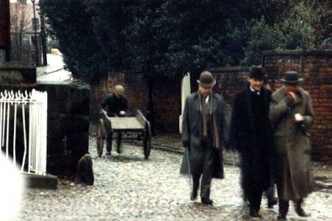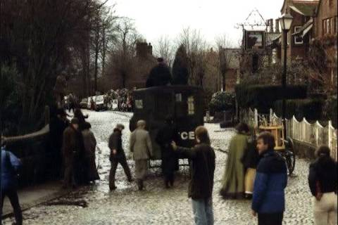Ci-dessous : photos de scènes de rue prises pendant le tournage de l'épisode Wisteria Lodge dans le petit village de Grappenhall, situé dans le Cheshire près de Warrington, au Nord-Ouest de l'Angleterre.