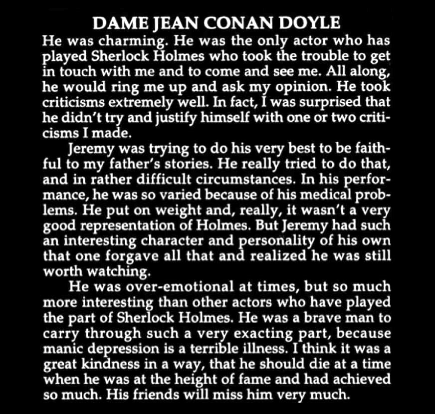 Peu de temps avant sa mort en 1995, Jeremy confia dans sa dernière interview à David Stuart Davies : "Je n'ai jamais eu l'impression d'avoir été Sherlock Holmes. Je ne l'ai jamais vraiment saisi, vous savez. Il était toujours en avance sur moi et je ne l'ai jamais rattrapé. Etre Sherlock Holmes est difficile, car il est insaisissable. Peut-être y suis-je parvenu une ou deux fois. Mais Sherlock Holmes est toujours présent. Il est l'un des génies intellectuels les plus impénétrables sur lequel on a jamais écrit. Les hommes le trouvent fascinant parce qu'il a une parfaite maîtrise de lui-même, tandis que les femmes voient en lui un défi : elles veulent briser cette carapace glaciale et révéler les vrais sentiments qui s'y cachent. Bien sûr, Holmes a aussi une part féminine en lui : l'intuition, qui fait partie de sa magie. Qu'il soit loué, il nous devance toujours. Mais j'ai vécu une période fascinante en l'interprétant. J'ai dit à Dame Jean [Conan Doyle] que j'avais dansé au clair de lune avec son père pendant dix ans. Au clair de lune et non dans la lumière du soleil... Holmes est un personnage très sombre."