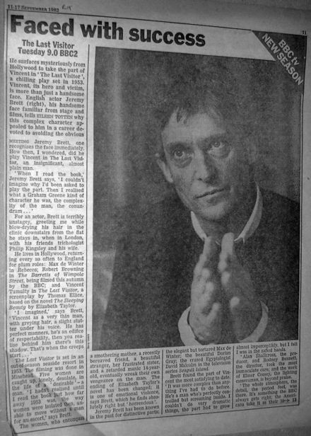Dans le passé, on a connu Jeremy Brett pour ses rôles caractéristiques : l'élégant mais torturé Max de Winter, le beau Dorian Gray, l'Egyptologue fou David Malcom dans la série télévisée "Seagull Island".