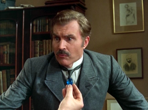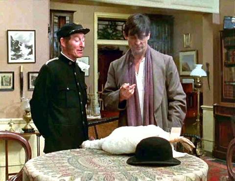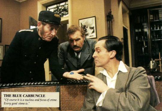 Holmes lui offre l’oie et garde le chapeau melon. En l’examinant, il en déduit une multitude de détails qui stupéfient Watson. Peu après, Peterson revient bouleversé. Son épouse vient de trouver une pierre bleue scintillante dans le jabot du volatile. Holmes réalise qu’il s’agit de l’Escarboucle bleue, pierre précieuse de valeur inestimable, qui vient d’être dérobée à la comtesse Morcar à l’Hôtel Cosmopolitan. L'inspecteur Bradstre et la police ont déjà un coupable tout désigné : le plombier, John Horner, déjà condamné par le passé. Mais il jure de s'être amendé depuis et clame son innocence.