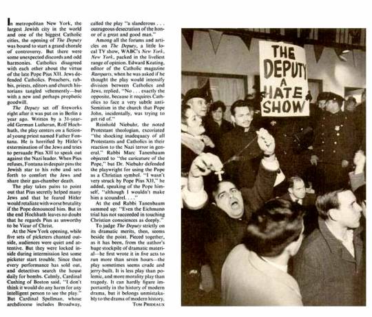 "Tous les soirs, dans la scène avec le Pape, j’ai parfois l’impression que le toit du théâtre est en train de s’effondrer sur moi. J’aimerais que Pie XII soit encore en vie pour se justifier. On ne peut pas condamner quelqu’un pour ces choses qui datent pratiquement d'hier. Simplement, j'ai peur quand je vois des jeunes de dix-huit ans dans le public. J’espère seulement qu’ils ne pensent pas que ce point de vue de la pièce est le seul qu'il faille entendre."