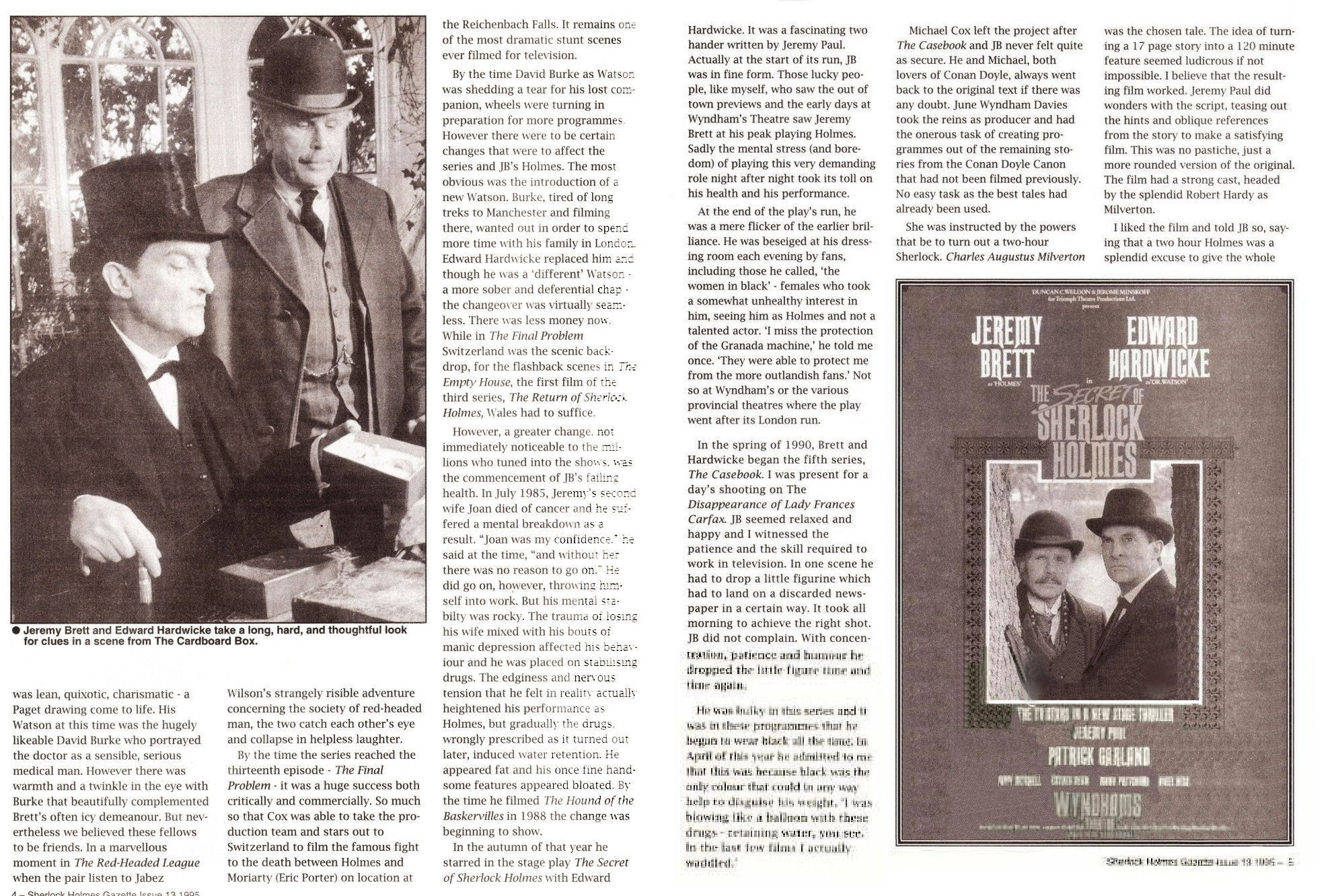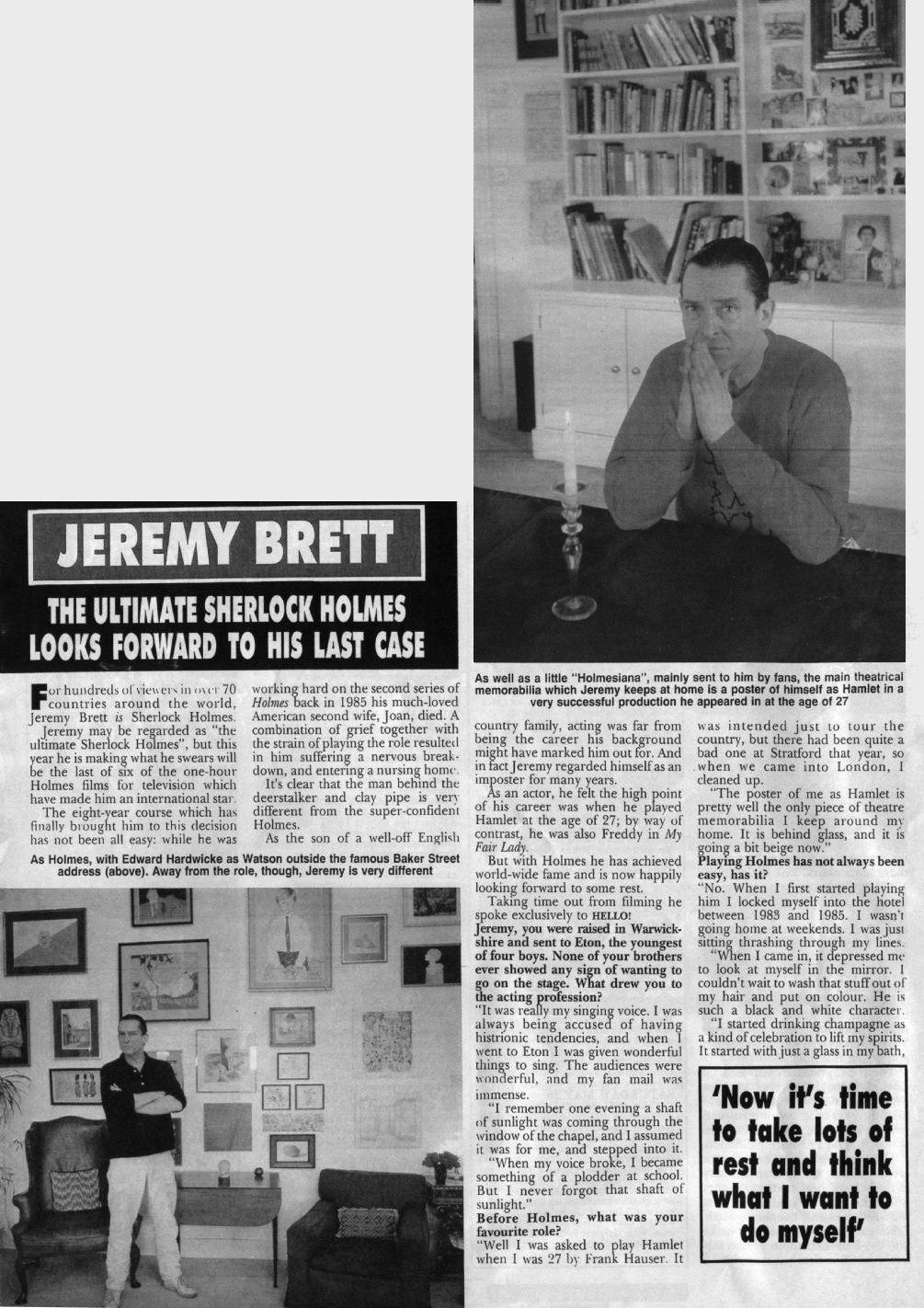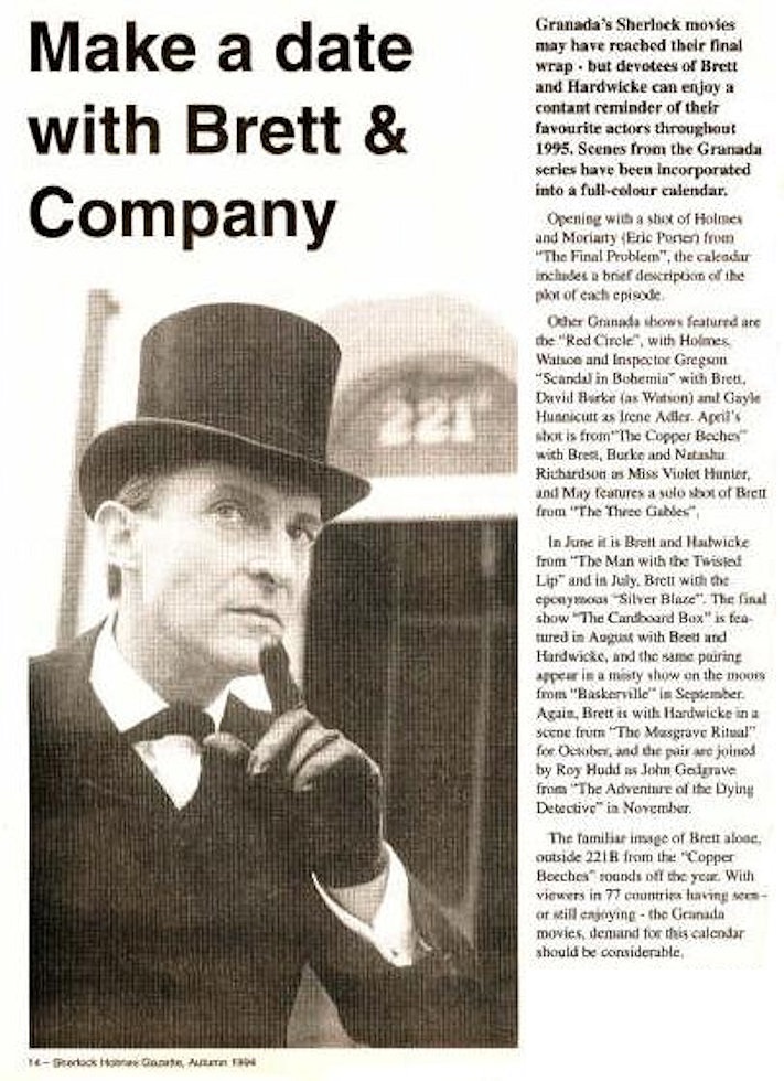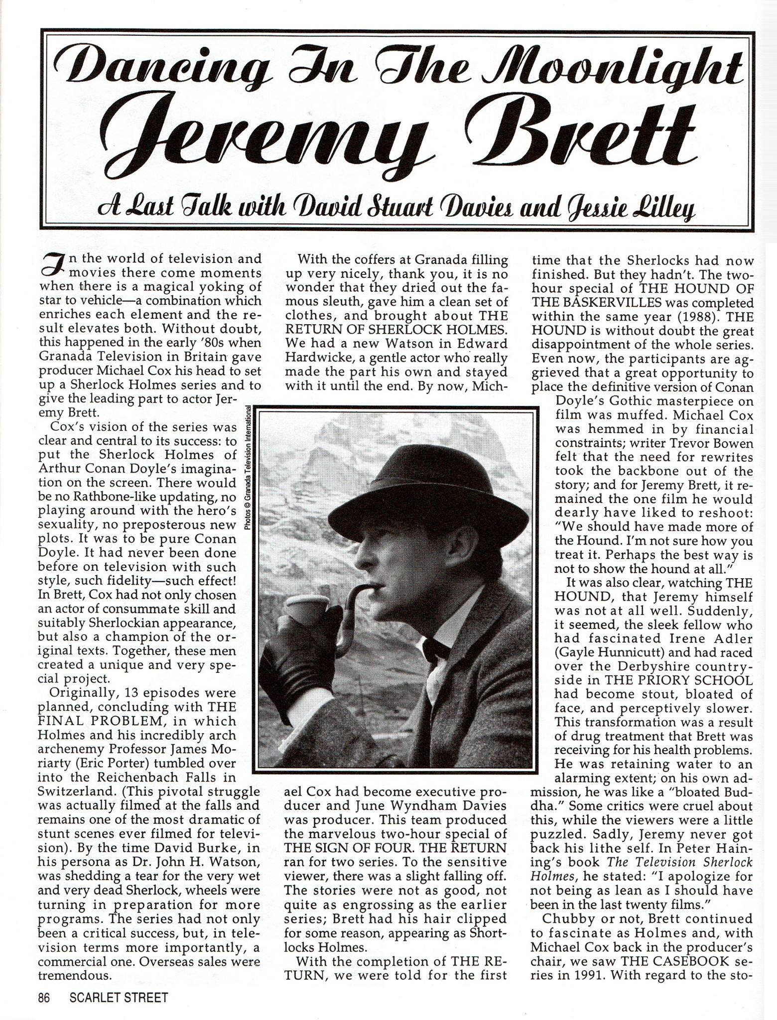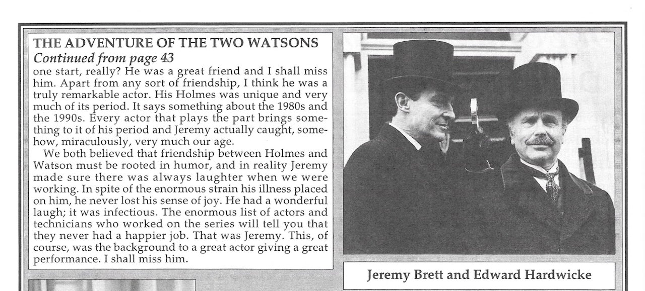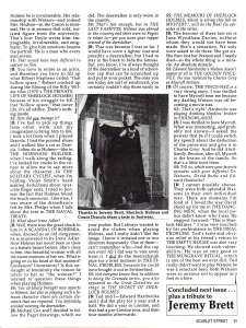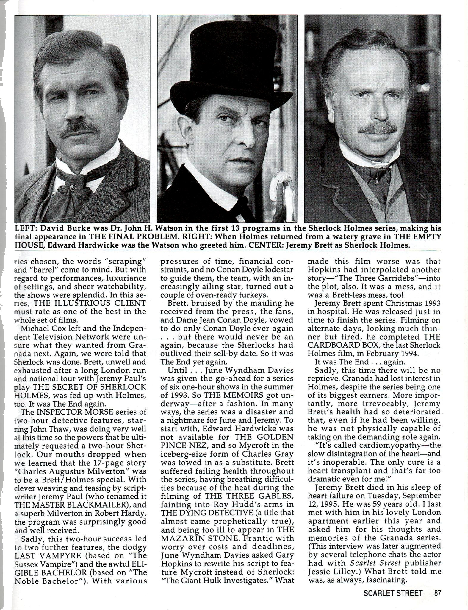 A TRIBUTE TO JEREMY BRETT paru dans la revue Scarlet Street, The Magazine of Mystery and Horror, No. 21, Winter 1996. Dans cet hommage, David Burke et Edward Hardwicke racontent leurs souvenirs et anecdotes pendant leurs années de travail avec Jeremy Brett.