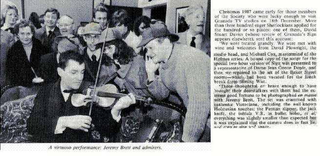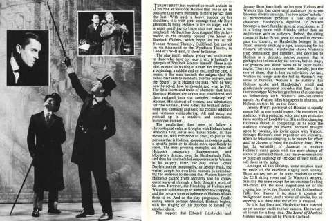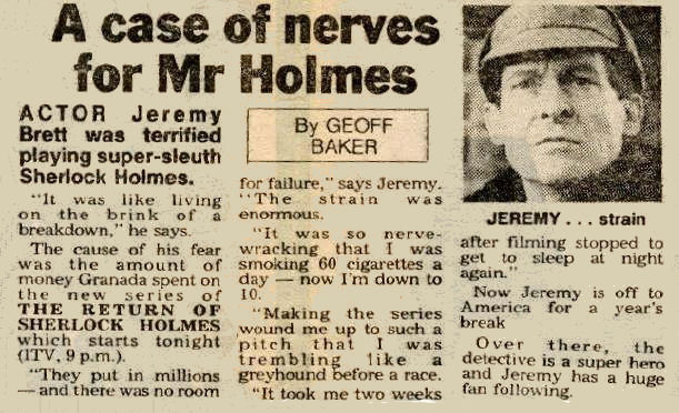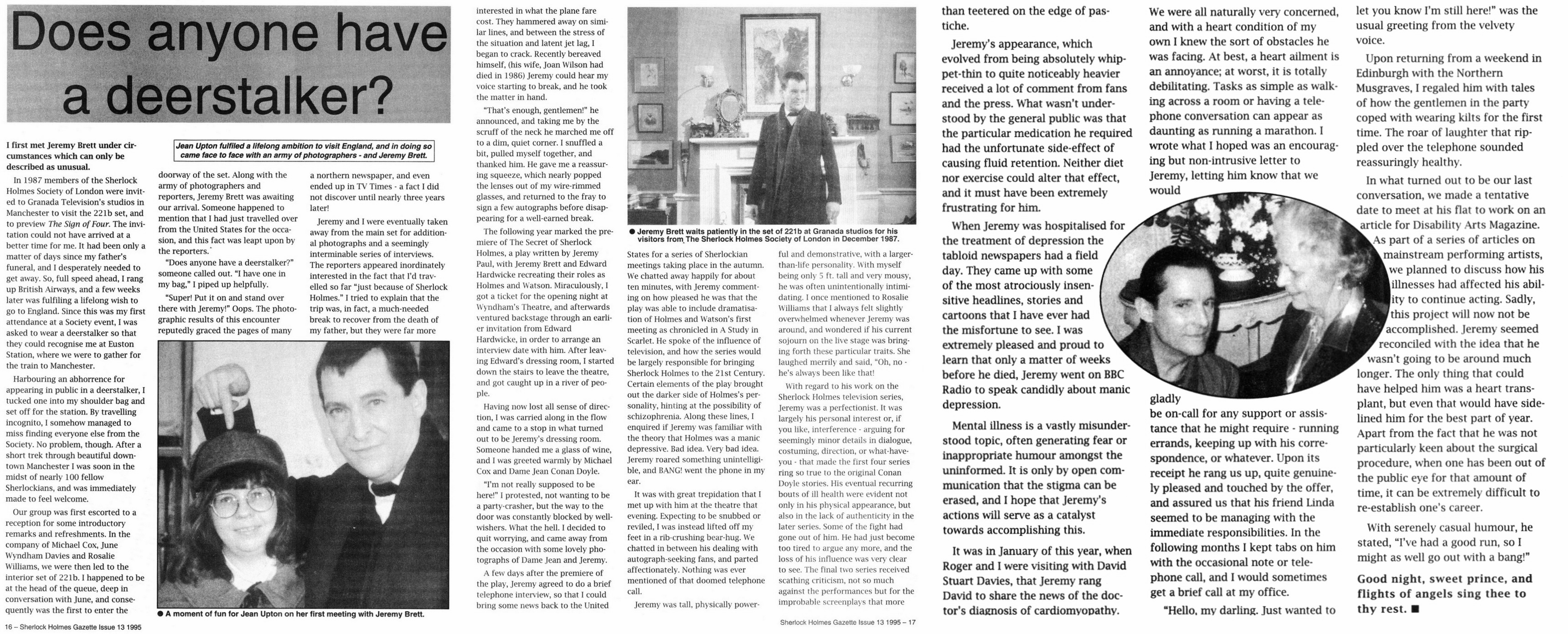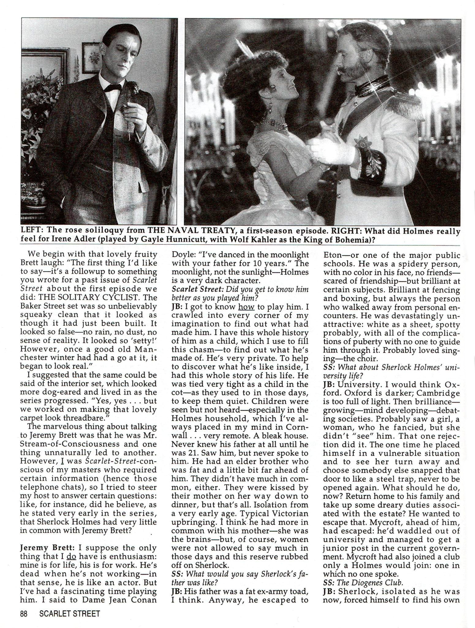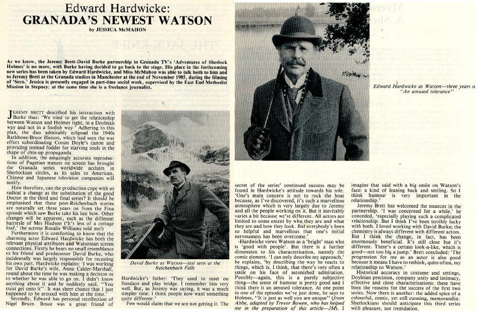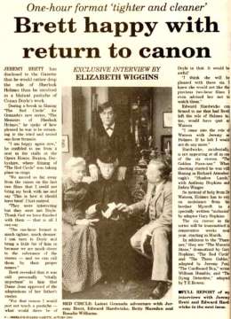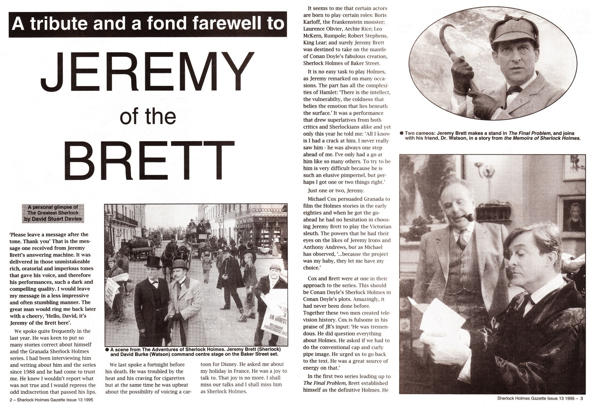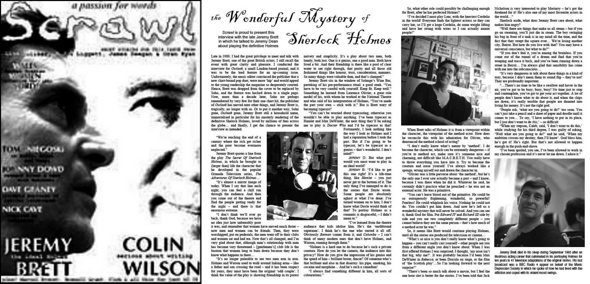 A TRIBUTE TO JEREMY BRETT paru dans la revue Scarlet Street, The Magazine of Mystery and Horror, No. 21, Winter 1996. Dans cet hommage, David Burke et Edward Hardwicke racontent leurs souvenirs et anecdotes pendant leurs années de travail avec Jeremy Brett.