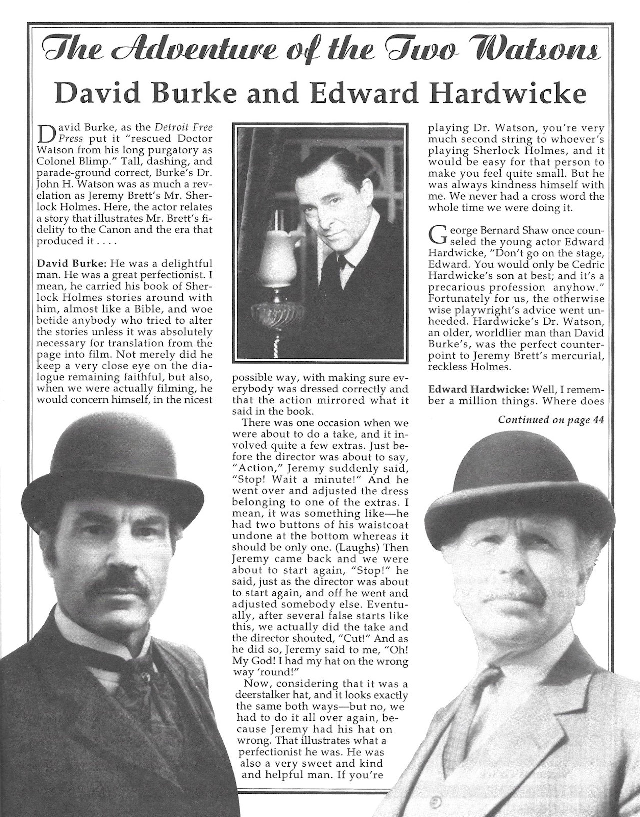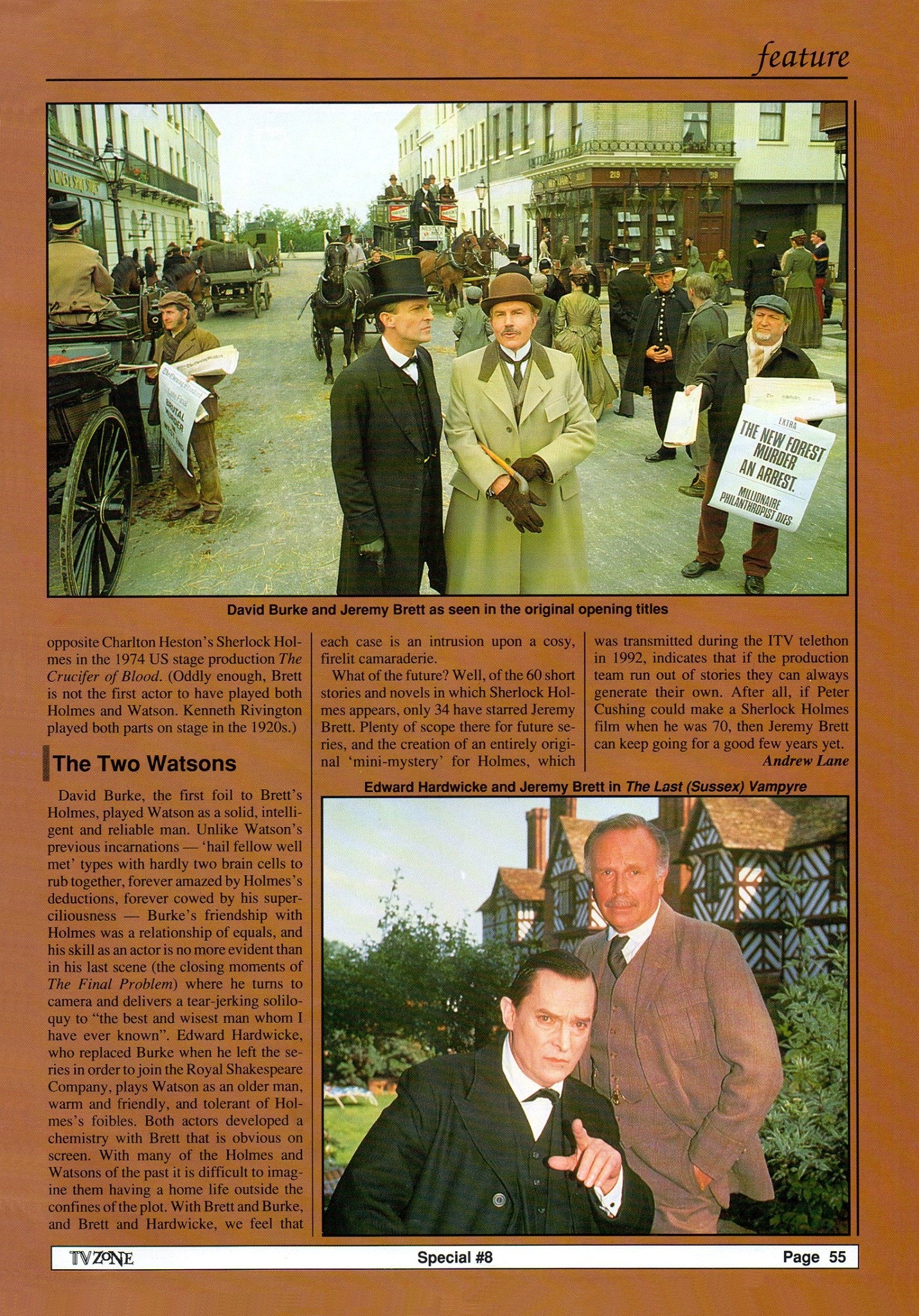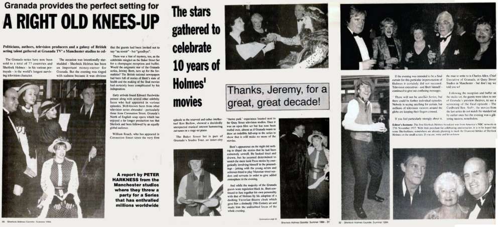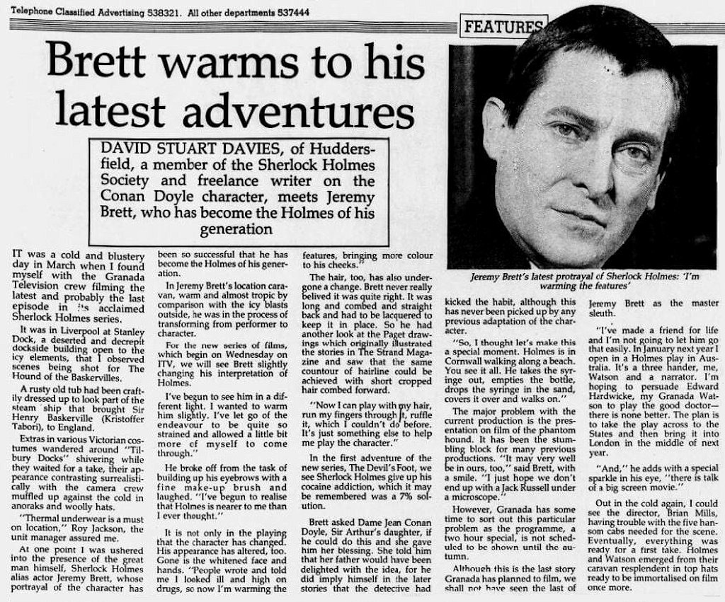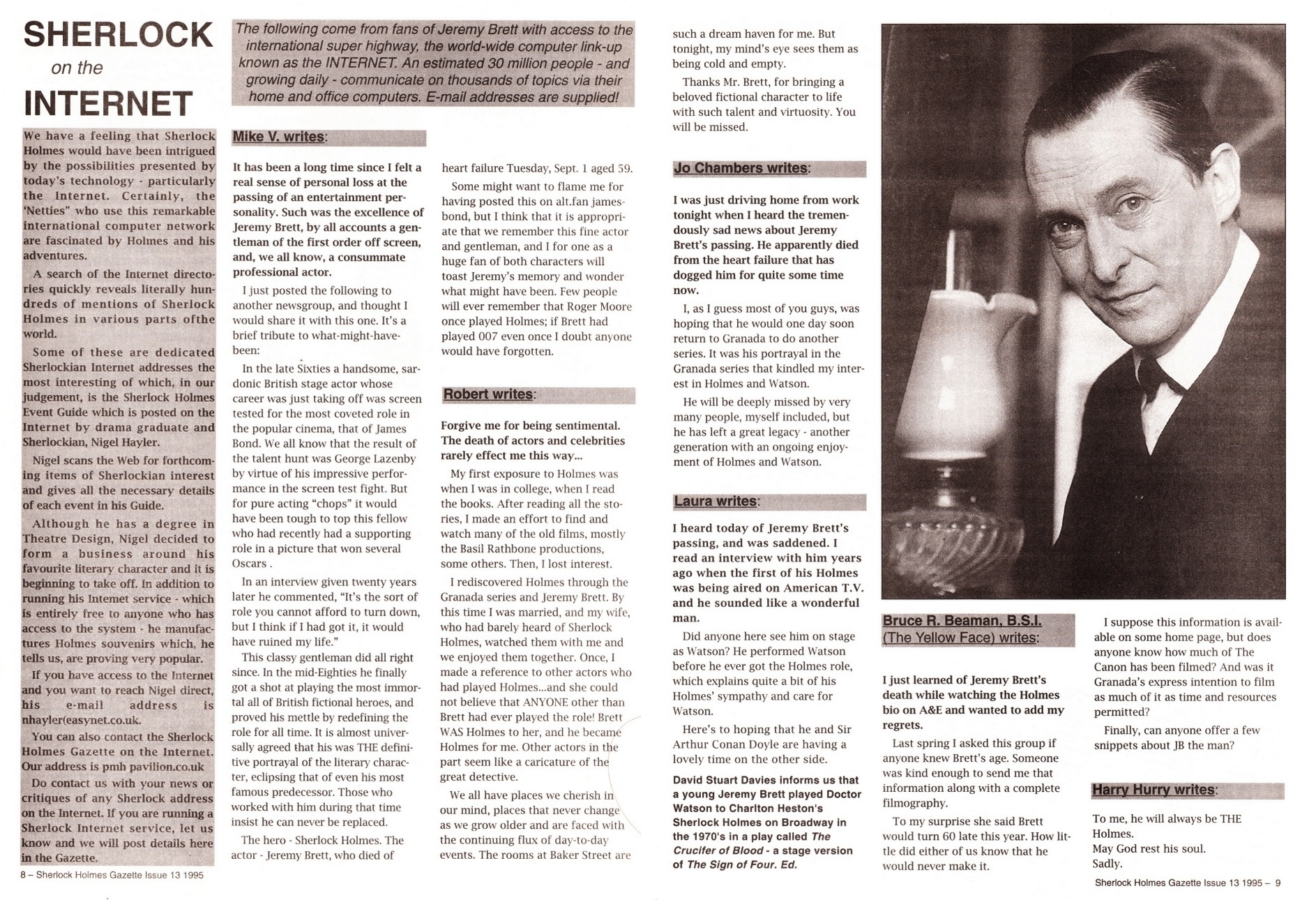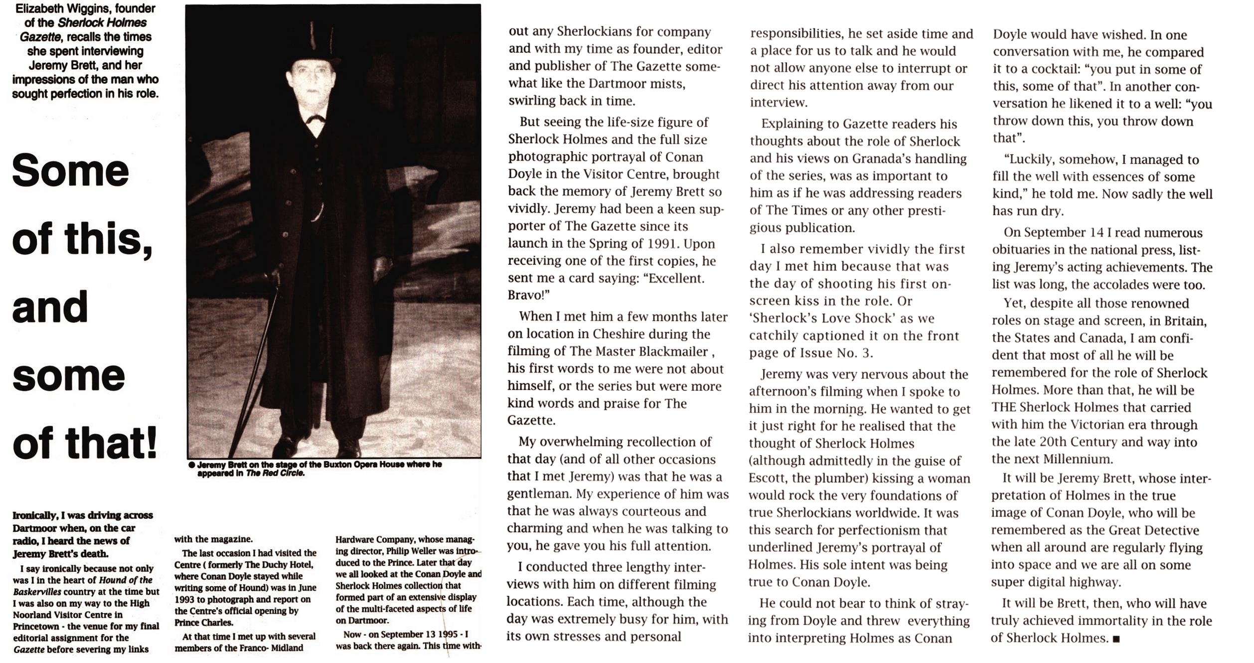 A TRIBUTE TO JEREMY BRETT paru dans la revue Scarlet Street, The Magazine of Mystery and Horror, No. 21, Winter 1996. Dans cet hommage, David Burke et Edward Hardwicke racontent leurs souvenirs et anecdotes pendant leurs années de travail avec Jeremy Brett.