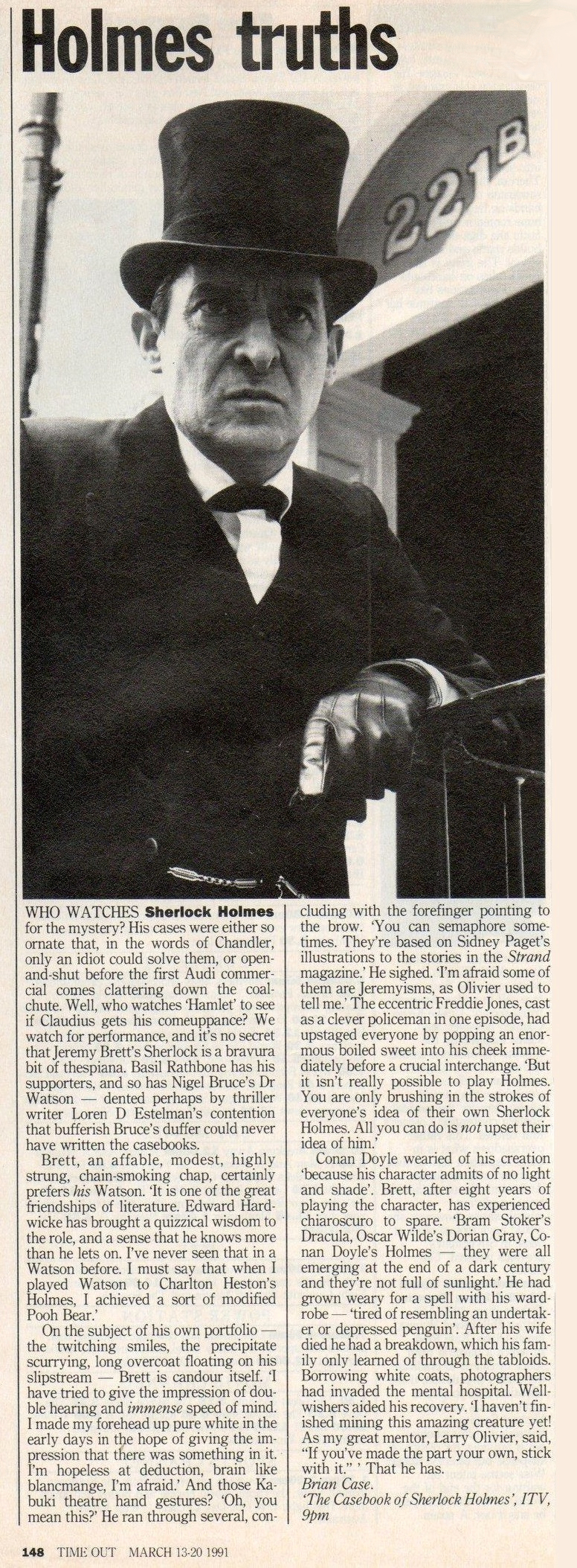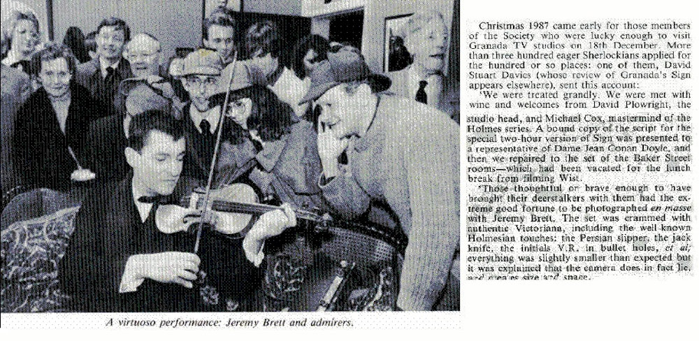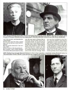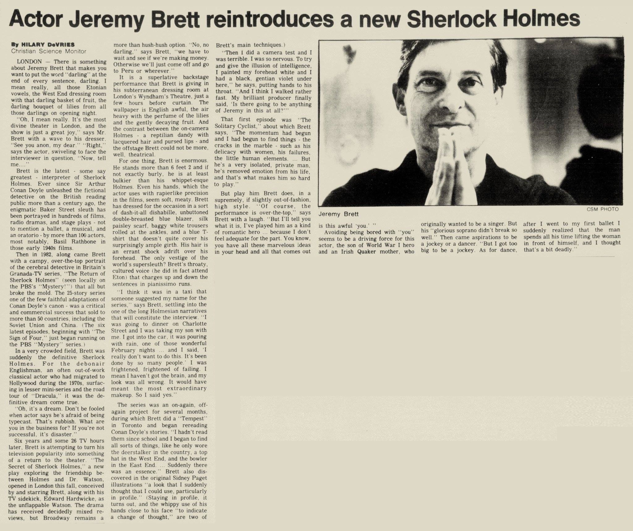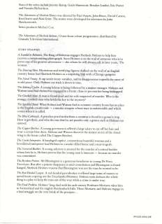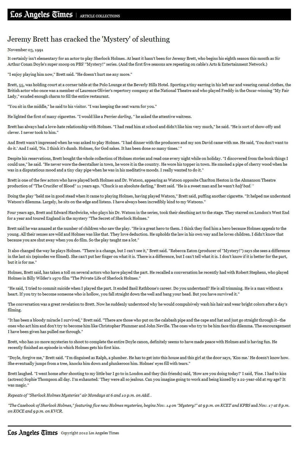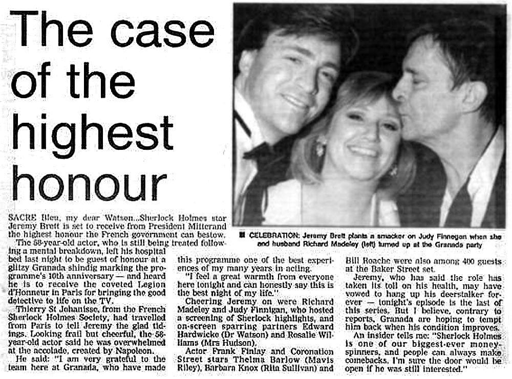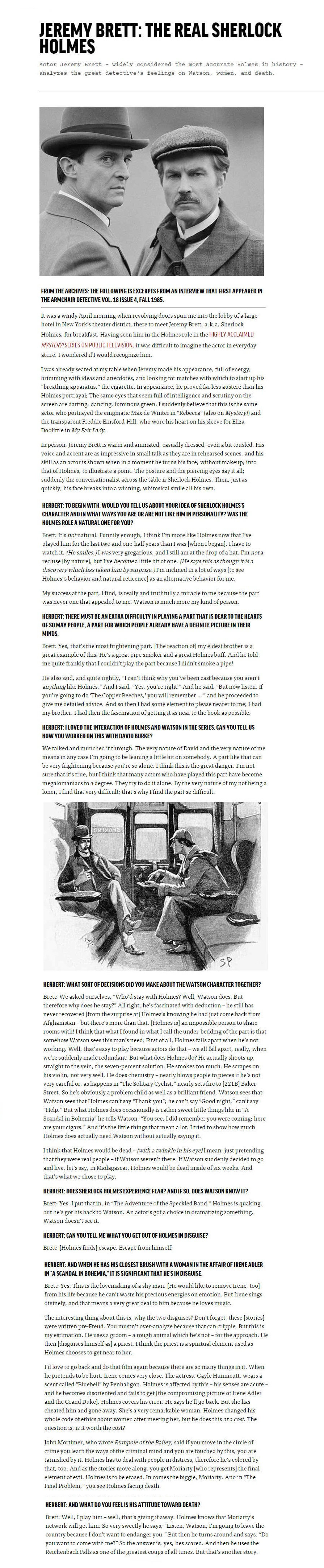 A TRIBUTE TO JEREMY BRETT paru dans la revue Scarlet Street, The Magazine of Mystery and Horror, No. 21, Winter 1996. Dans cet hommage, David Burke et Edward Hardwicke racontent leurs souvenirs et anecdotes pendant leurs années de travail avec Jeremy Brett.
