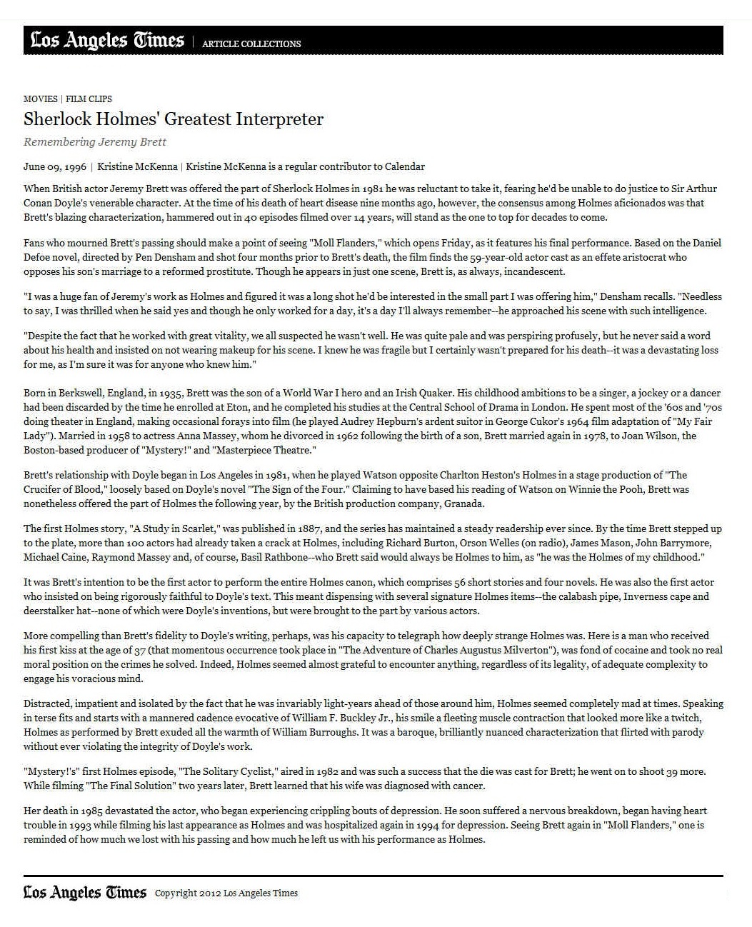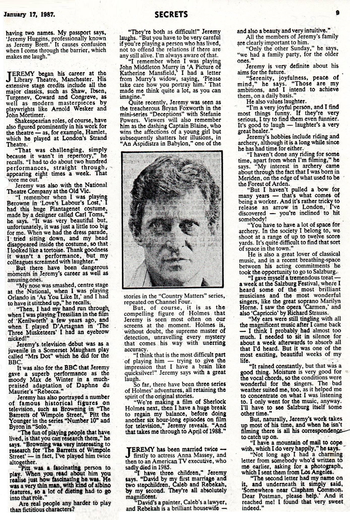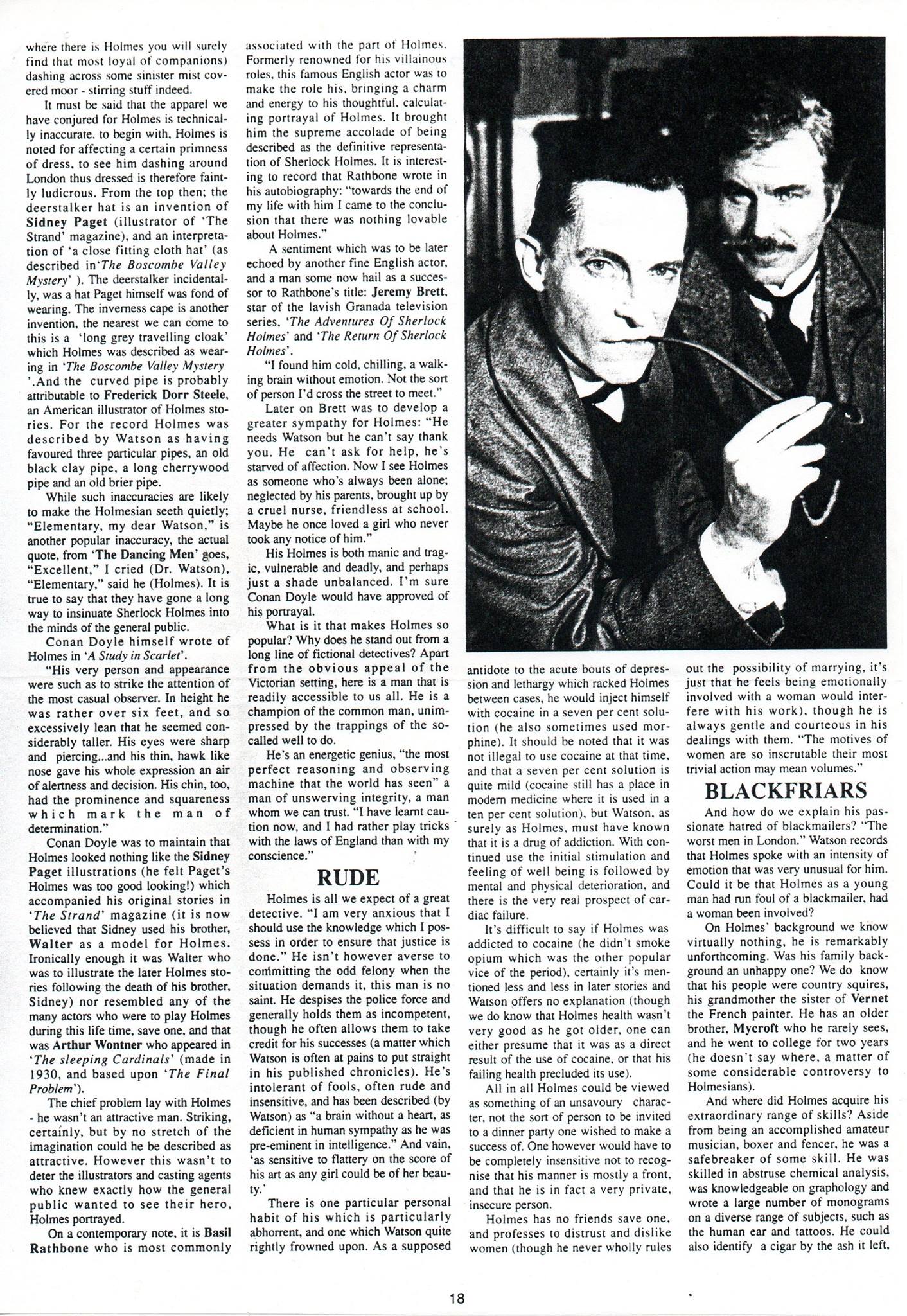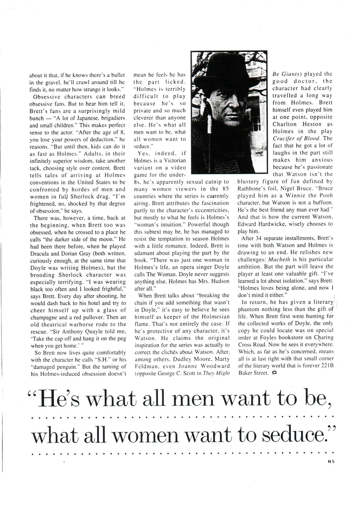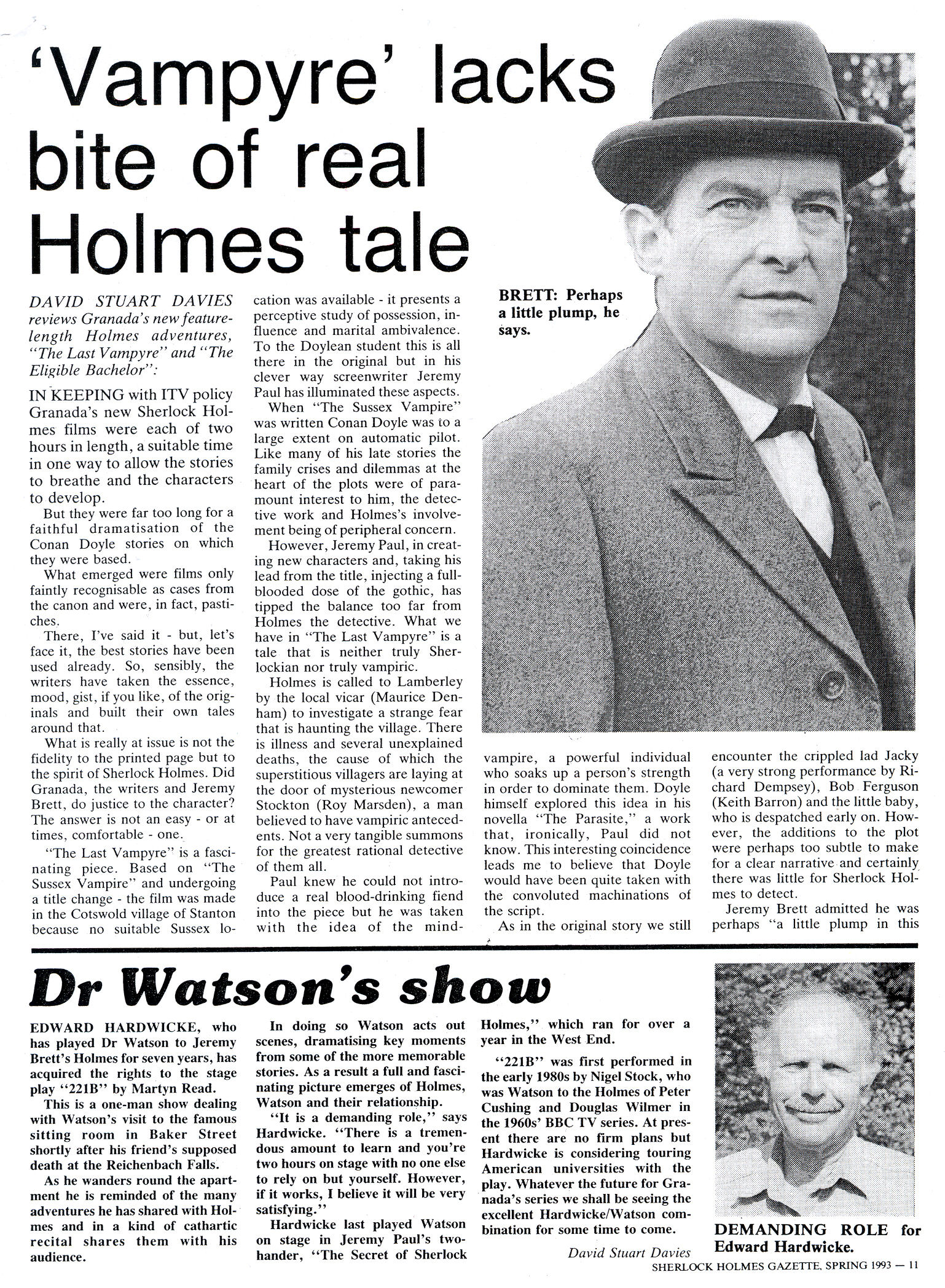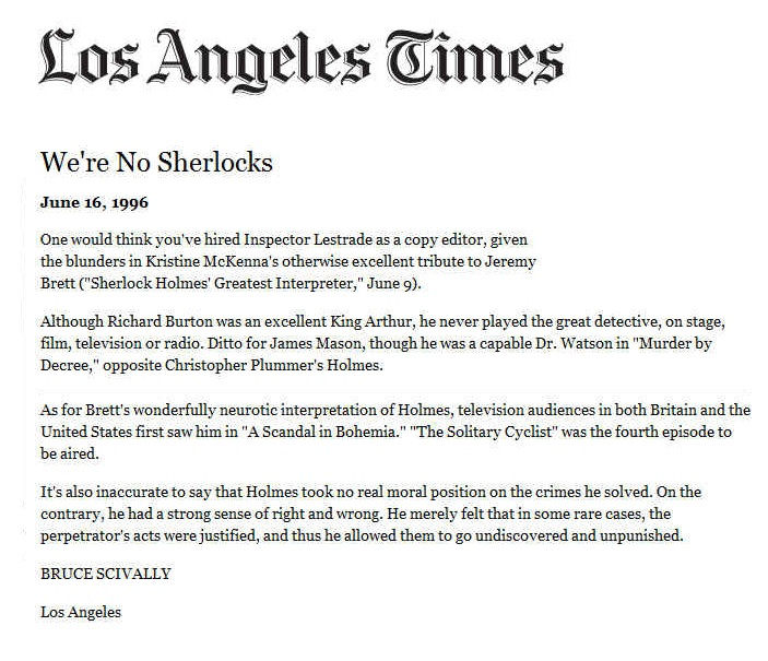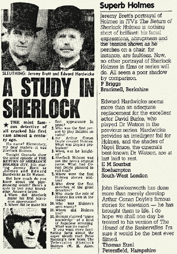 A TRIBUTE TO JEREMY BRETT paru dans la revue Scarlet Street, The Magazine of Mystery and Horror, No. 21, Winter 1996. Dans cet hommage, David Burke et Edward Hardwicke racontent leurs souvenirs et anecdotes pendant leurs années de travail avec Jeremy Brett.