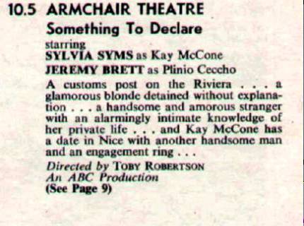 "... En haut de l'affiche de cette production, il y a Sylvia Sims, qui avait un contrat de vedette avec Associated British Pictures pendant huit ans, et qui fait sa première apparition à Armchair Theatre. Son partenaire Jeremy Brett n'était pas étranger aux dramatiques de ABC Television, mais il venait à peine de rentrer des États-Unis après le tournage de My Fair Lady et d'être sur Broadway. "