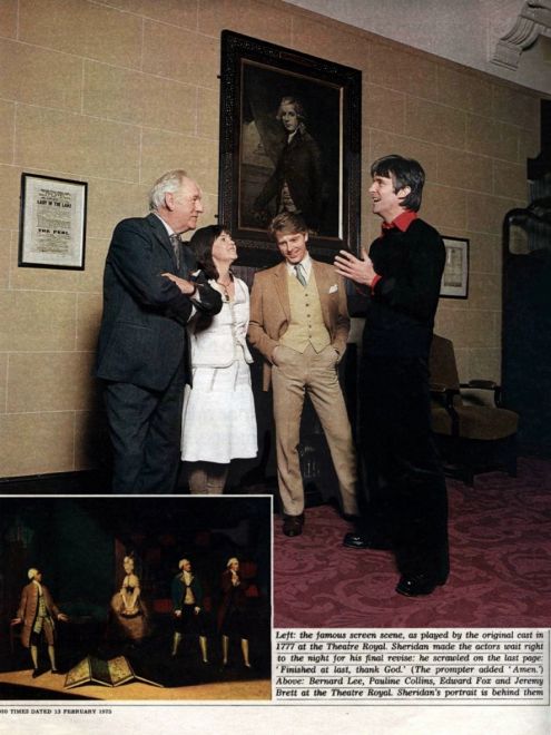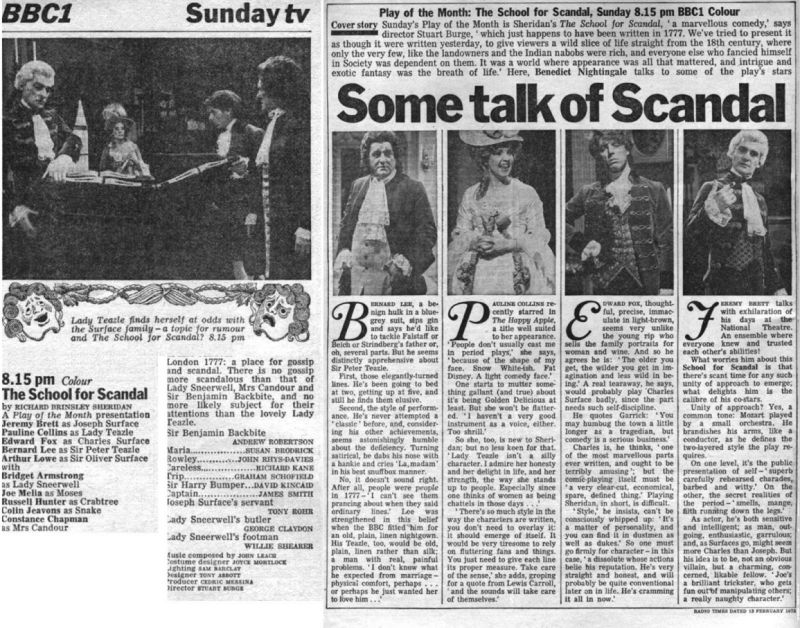 Très populaire au XVIIIème siècle, The School for Scandal ne suscite plus le même engouement avec le public contemporain. A notre époque en effet, ce genre de comédie perd de son intérêt, notre société aux mœurs permissifs, étant terriblement éloignée de celle des années 1700 ! Pour les normes actuelles, la pièce semble artificielle, dans les caractères, les expressions, les motivations des personnages et bien sûr leurs tenues vestimentaires. La pièce fut présentée dans le cadre prestigieux de la série Play of the Month, en 1975.
